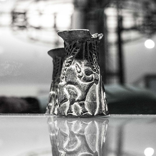 The burials were often accompanied by grave goods: pottery, metal vessels, jewelry, seals, weapons, household models, and cosmetic items. These were intended for use in the afterlife and varied widely in quantity, ranging from a single object to over two dozen. Social stratification is thus evident, suggesting Shahdād’s community had defined class structures. Among the grave goods, carved objects of chlorite, marble, and lapis lazuli point to long-distance trade with regions such as Afghanistan, the Indus Valley, and Mesopotamia.